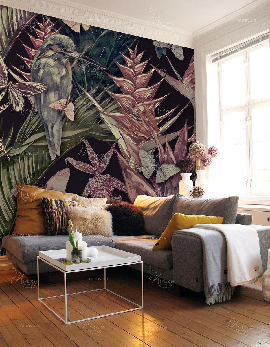 Birds and butterflies on a dark background