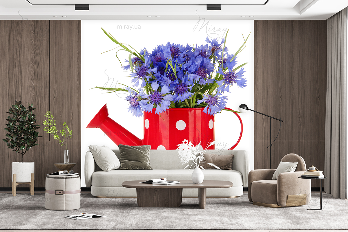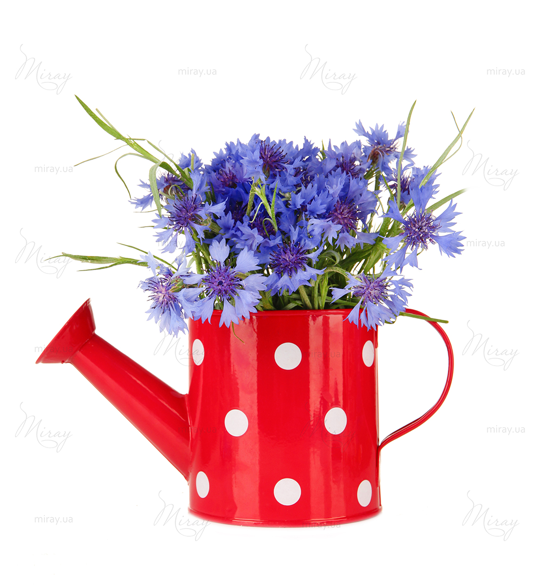 Cornflowers in a red watering can