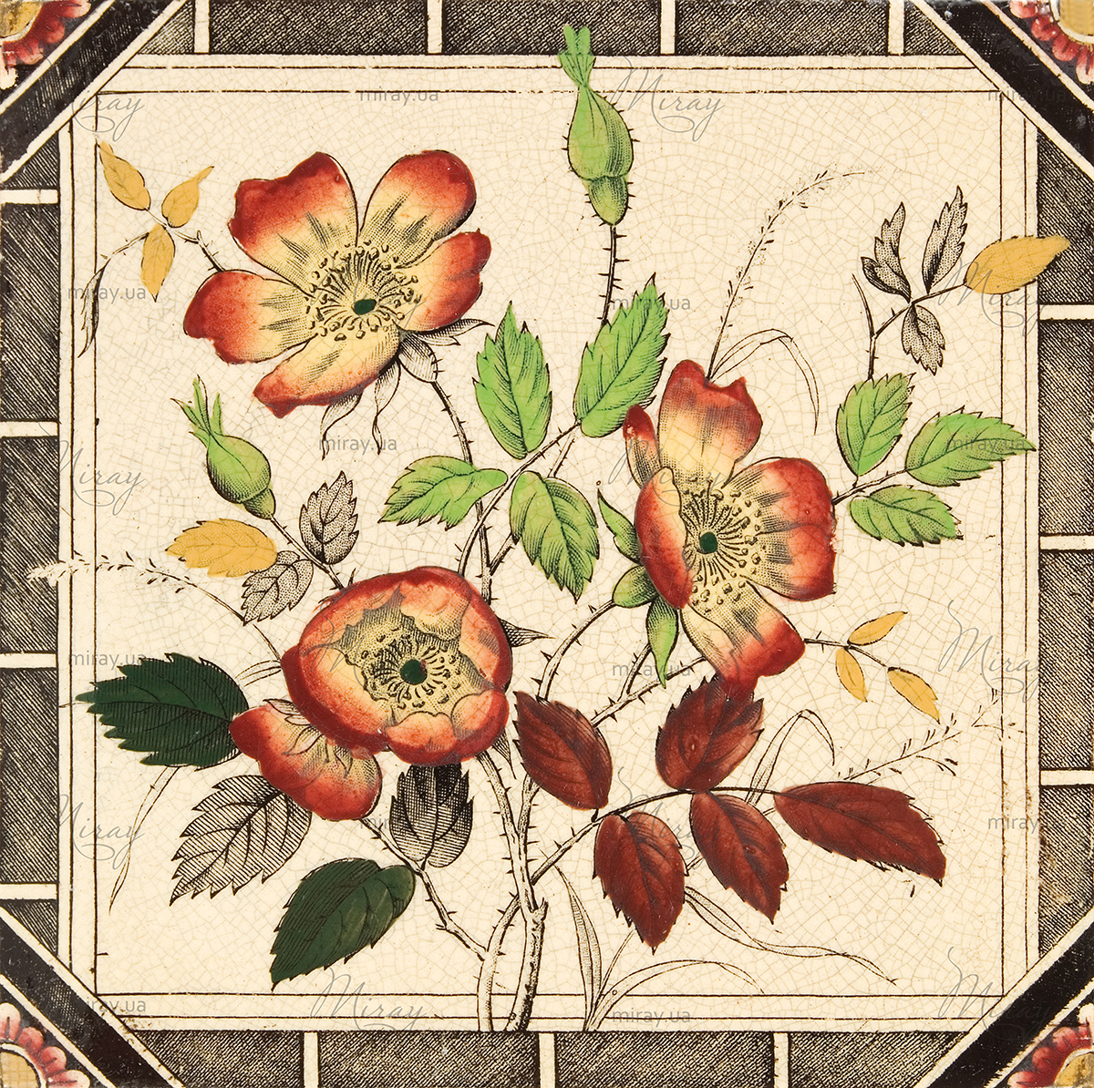 Decorative tiles with rosehip design c 1880