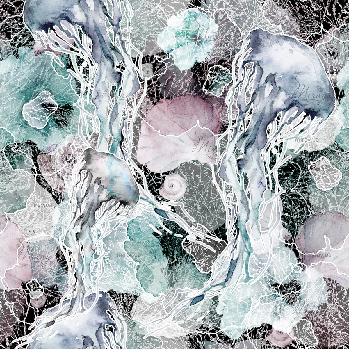 Watercolor,Print,With,Marine,Floral,Pattern.,Jellyfish,,Algae,,Underwater,Grasses,