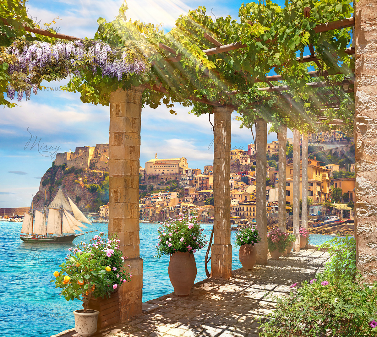 f-03-071-Old seaside town overlooking the bay and sailboat