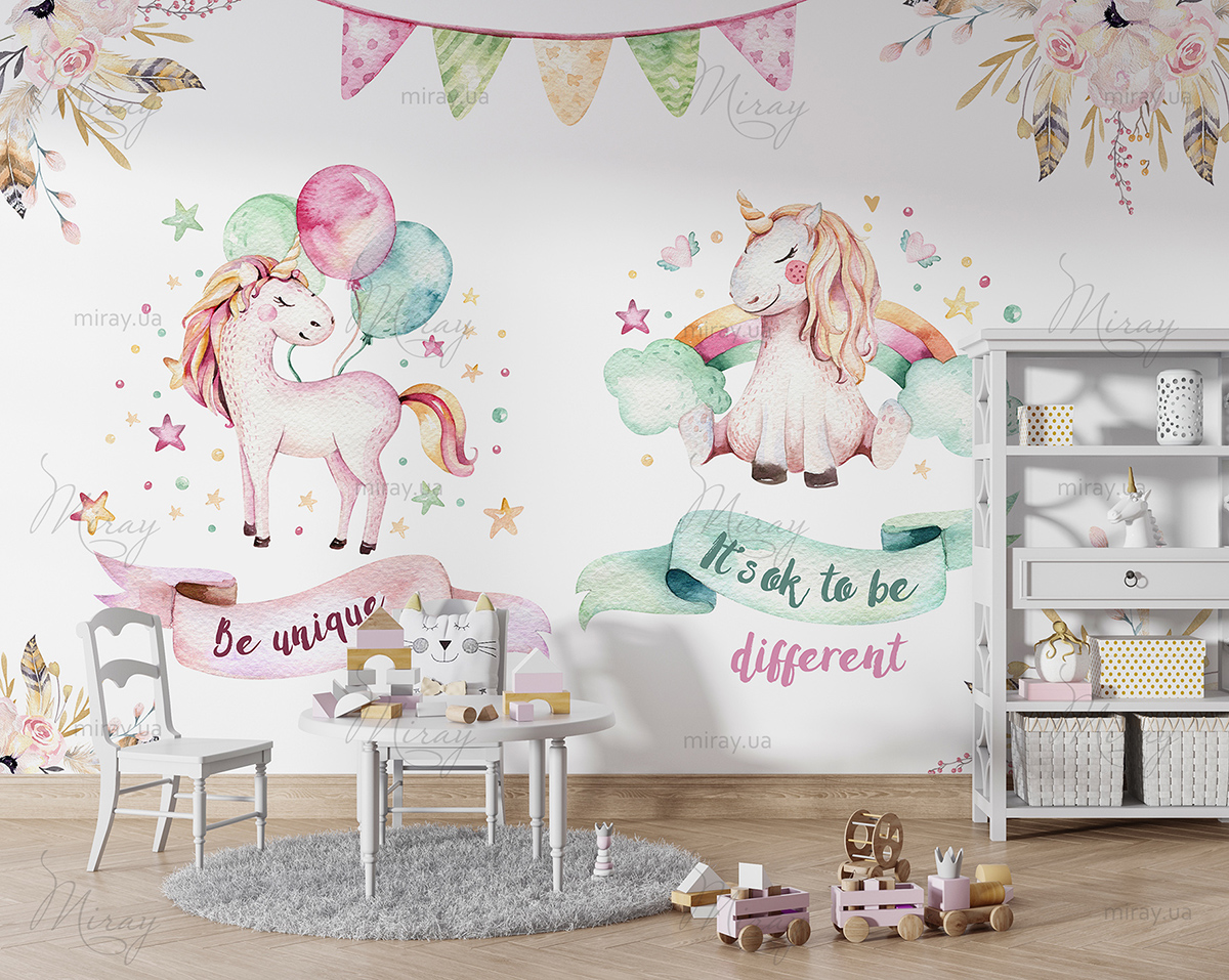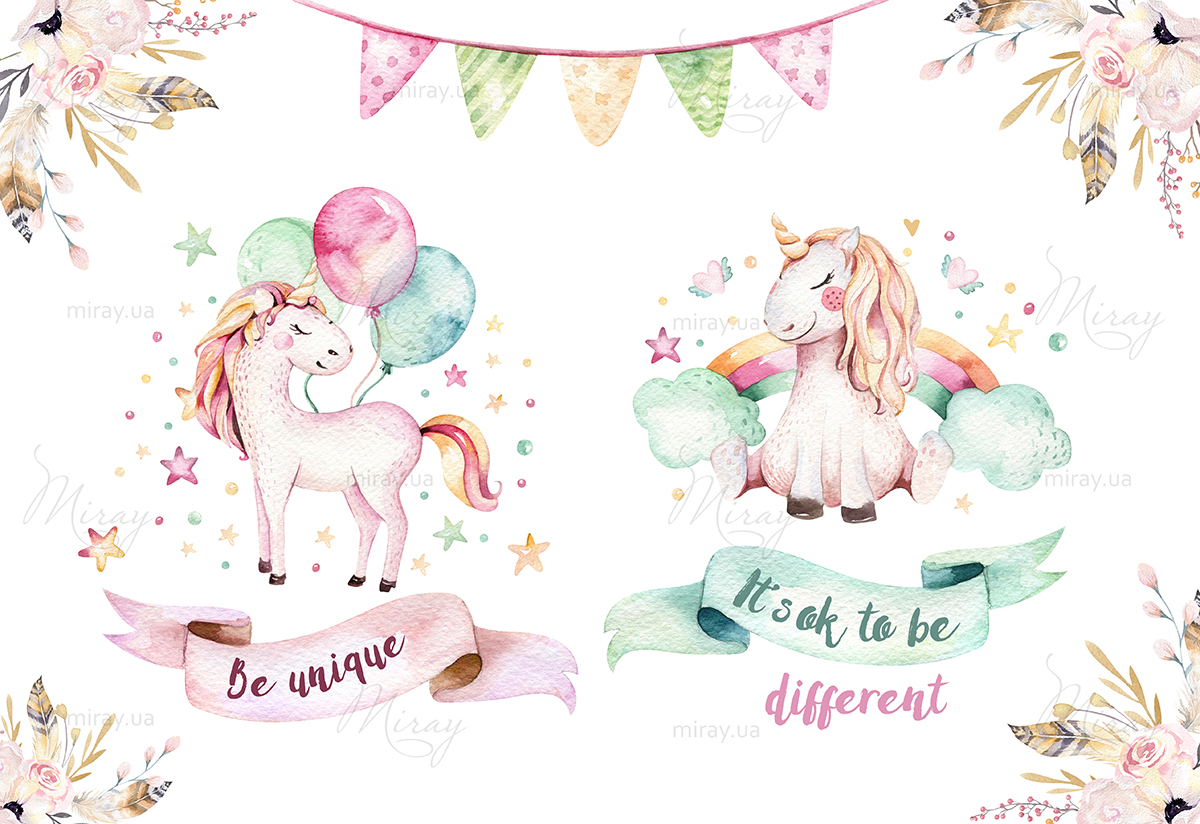 Unicorns with balloons and rainbow