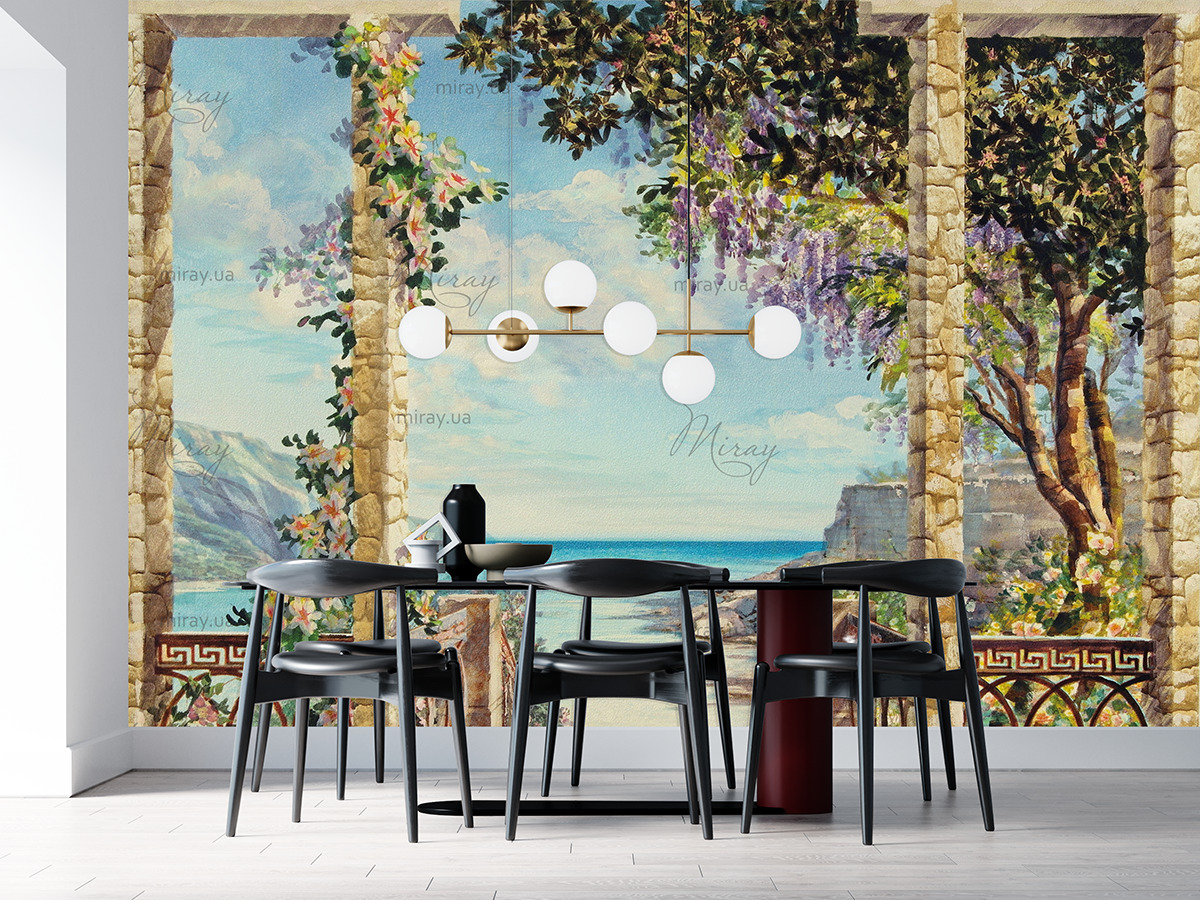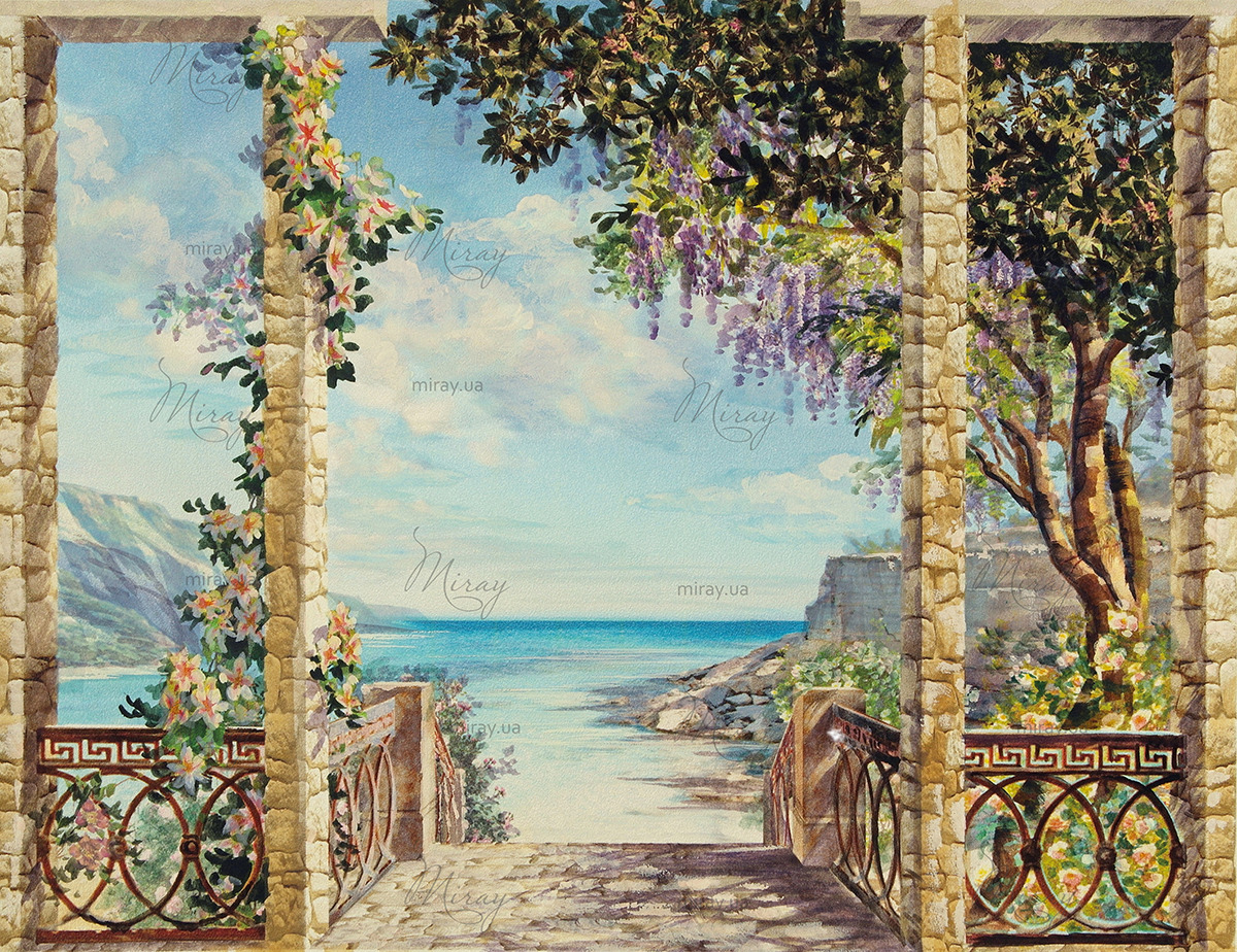 f-02-001-Акварельний малюнок. Вид з тераси на море з квітучими деревами 2