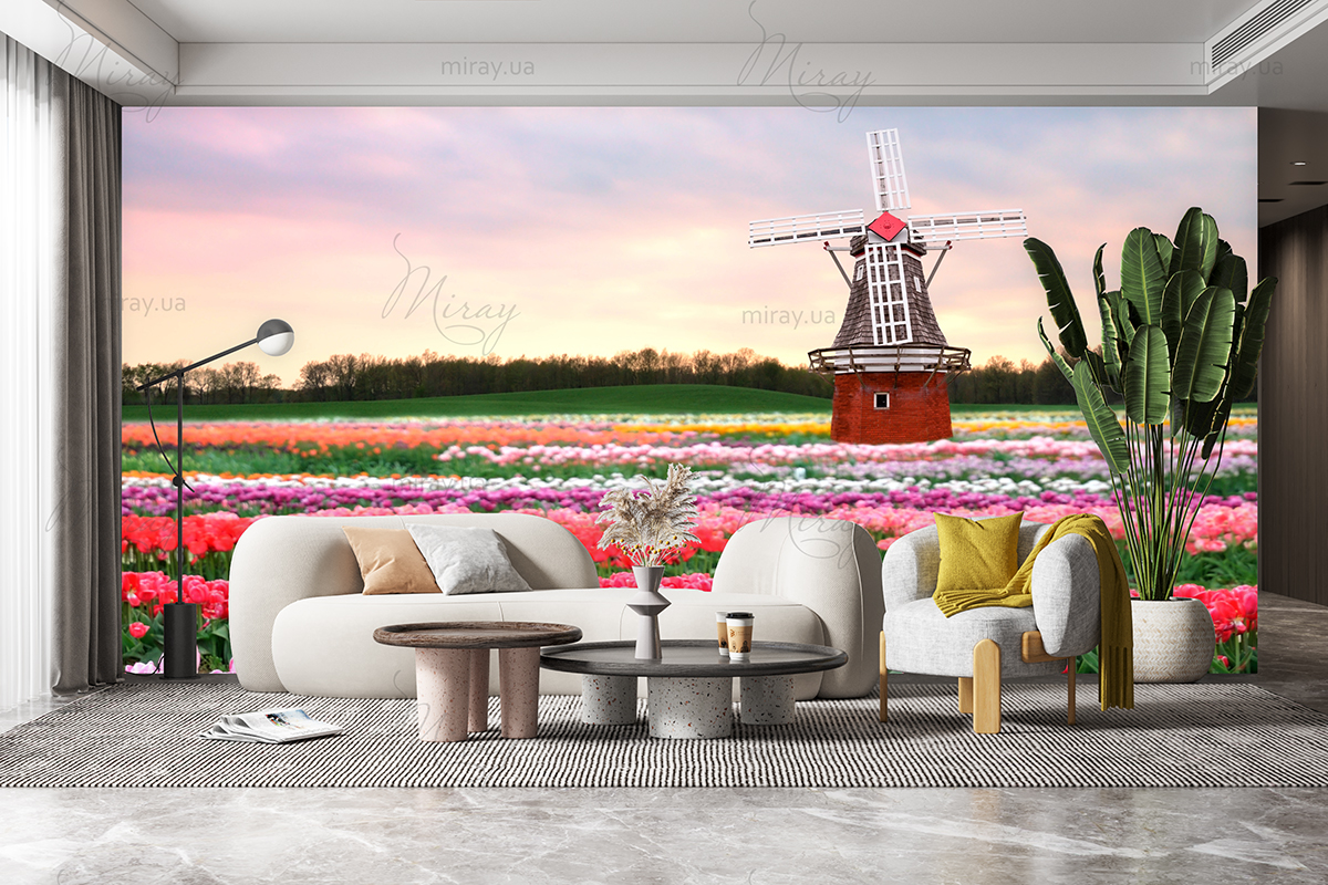 Поле тюльпанов с мельницей