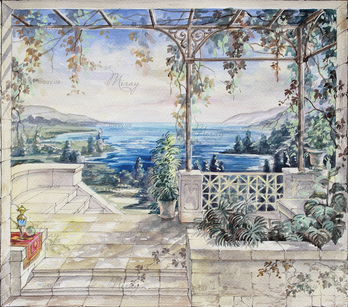 f-02-007-Вид с террасы на море с деревьями и цветами